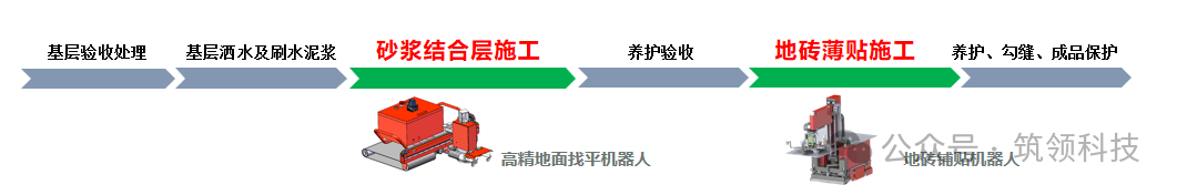 通过采用筑领科技研发的高精地面找平机器人对原建筑结构地面进行干拌砂浆整平施工,使其平整度、强度、密实度满足质量要求标准,进而能够实现地砖铺贴机器人薄贴施工,代替传统地砖厚贴来实现地砖面层的交付。